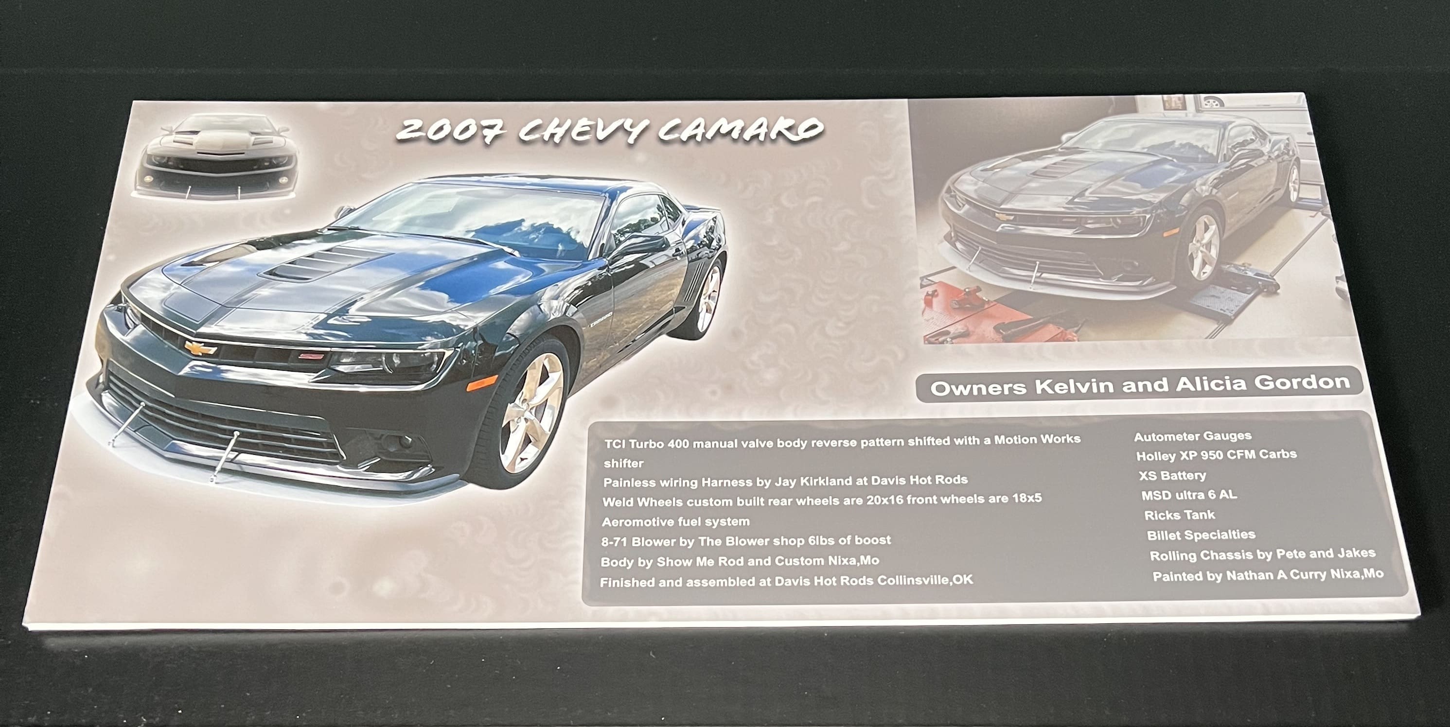 Make your vehicle’s story impossible to miss. Our custom car show boards showcase your year, make, model, and mods with clean, show-ready design. Choose your size and material, upload your photos, and we’ll create a board that complements your theme. UPS Ground shipping is included in your price.